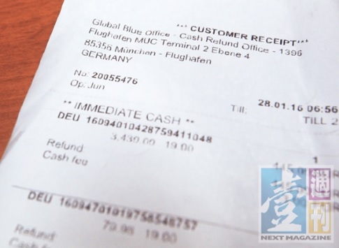 Taipei - Mr. Huang had taken Austrian Airlines to fly to Vienna from Germany and took a connecting China Airlines flight back to Taiwan. "I bought three LV bags, a few pieces of clothing and a RIMOWA suitcase to pack all these items worth more than half a million TWD. Customs inspected the suitcase in Munich airport." he said. Mr Huang took the receipt of purchase to the counter for declaration and tax rebates.